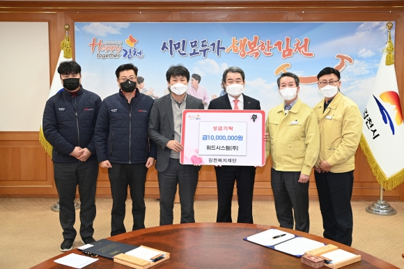 이날 성금전달을 위해 김천시청을 찾은 김명준 대표이사는 “새해를 맞아 도움의 손길을 필요로 하는 지역 이웃에 도움이 되고자 이번 모금에 동참하게 됐다.”며 “위드시스템㈜는 지역사회와 함께 발전하며 앞으로도 지속적인 나눔을 실천하겠다.”고 말했다.