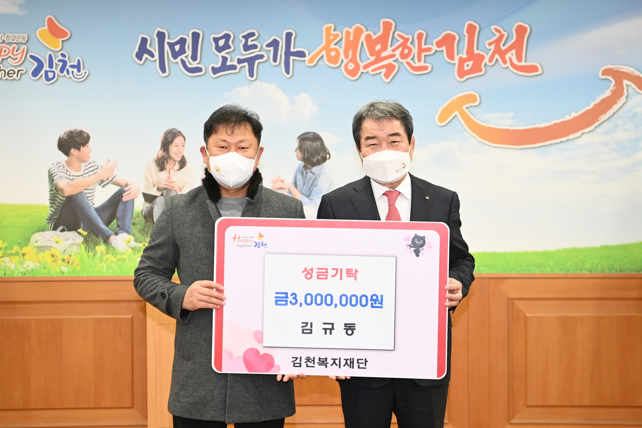 | 대덕면 김규동(대한양계협회 김천시 채란지부 총무)씨는 지난 12일 김천시(시장 김충섭)를 방문해 김천복지재단 성금 300만원을 기탁했다.