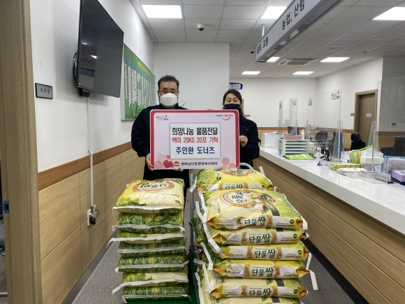 | 남산동에 위치한 주인완 도너츠(대표 주인완)는 지난 10일 설 명절을 맞아 백미20Kg 20포를 평화남산동 행정복지센터에 기탁했다. 주인완 대표는 주위 어렵고 힘든 이웃들을 위해 매년 명절마다 백미를 후원해오며 이웃사랑을 실천하고 있으며 전달받은 후원 물품은 평화남산동 관내 저소득층 및 복지사각지대가구에 전달될 예정이다.