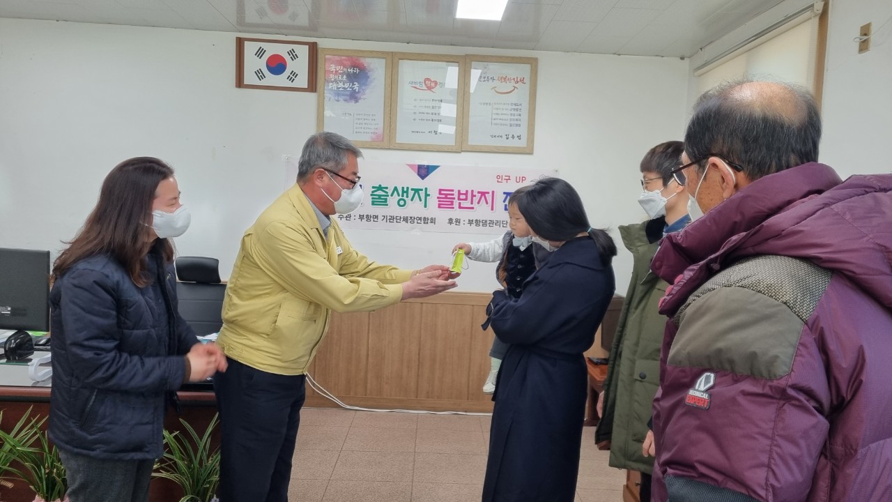 | 부항면행정복지센터(면장 이성화)는 14일 관내 첫돌을 맞은 아기에게 돌반지를 선물했다.