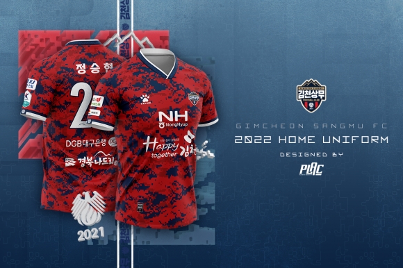 김천상무프로축구단(대표이사 배낙호)이 2022 유니폼을 공개했다. K리그 팀들 중 유일한 군 팀인 김천상무에 걸맞게 현재 대한민국 국군의 대표 패턴인 ‘디지털 카모플라쥬(Camoflauge)’ 패턴을 유니폼 전체에 입혔다.