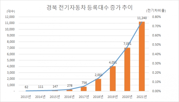 경북도의 전기차 누적 등록대수 증가 추이를 살펴보면 해가 갈수록 빨라지고 있다. 2013년 민간보급시작 이후 2018년까지 6년간 2001대에 불과했으나, 2019년 4051대, 2020년 7051대, 지난해 말 기준으로 보면 1만1240대를 기록하고 있다. 올해 말에는 2만대를 돌파할 것으로 전망되고 있다.