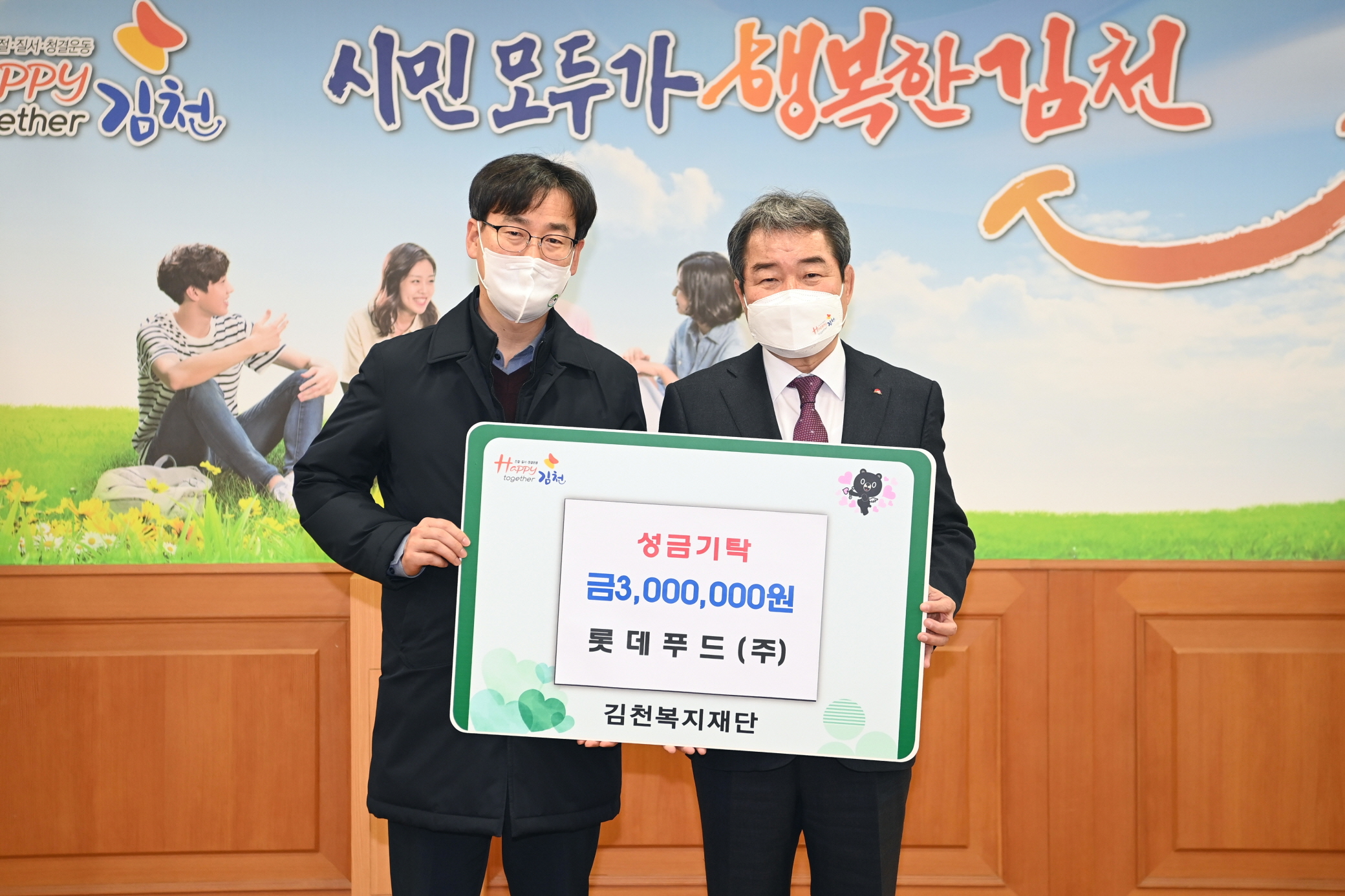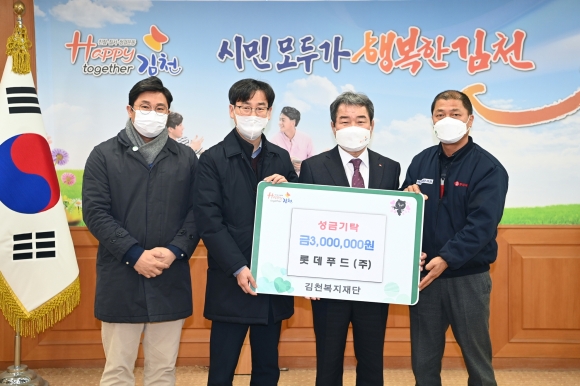 | 롯데푸드㈜(대표 이진성)가 성금 3백만 원을 김천복지재단에 기탁하며 코로나19로 어려움을 겪고 있는 김천시민들에게 도움이 되기를 바란다고 전했다.
