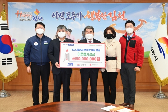 | ㈜KCC(대표 정몽진)는 지난 20일 김천시 지역의 저소득층 가정과 소외된 이웃을 위해 써달라며 김천시청을 직접 찾아 성금 5천만 원을 전달했다. KCC는 사회적 공유가치 창출 활동의 일환으로 도움이 꼭 필요한 곳에 지원이 되도록 매년 성금을 기탁하며 온정 나눔을 실천하고 있다.