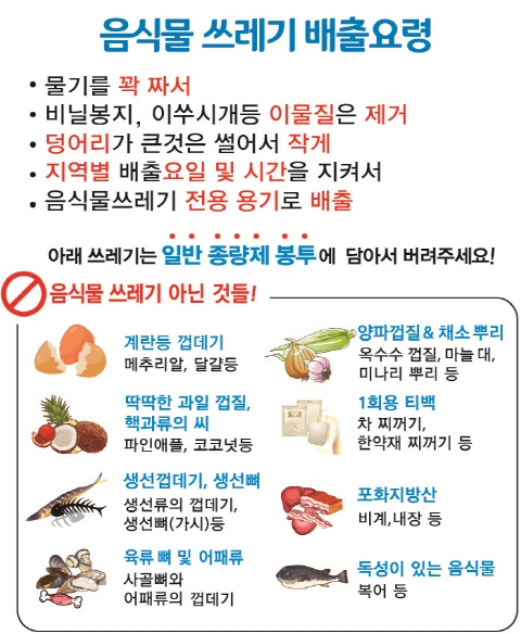 먹고 남은 음식물을 버릴 때 음식물 쓰레기 수거함에 넣어야 할지, 일반 종량제 쓰레기봉투에 버려야 할지 헷갈리는 것들이 있는데 이러한 모호한 기준을 구분하는 가장 간단하면서도 확실한 기준은‘동물의 사료로 쓰일 수 있는지 여부’이다.