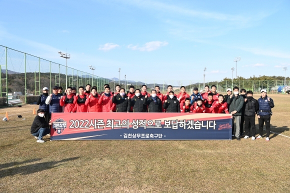 | 김천상무프로축구단 구단주(시장 김충섭)가 21일 부산 기장월드컵빌리지에 방문해 선수단을 격려했다.