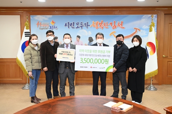 | 서일산업(주)대광LPG충전소 대표 함성호는 지난 21일 김천시청(시장 김충섭)을 방문해, 초록우산어린이재단 경북지역본부(본부장 문희영)와 김천후원회(회장 전광득)와 함께 김천시 저소득층을 위해 후원금 전달식을 가졌다.