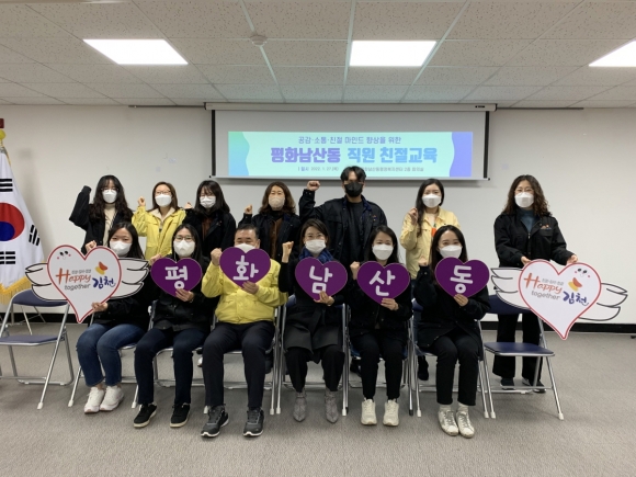 지난해에 이어 실시된 ‘Happy together 김천! 평화남산동 직원 친절교육’은 시민들의 행정 수요가 다양화됨에 따라 전문 강사를 통한 직원 친절교육을 통해 공감·소통·친절 마인드 함양으로 민원만족도 향상을 위해 마련되었다. 이번 친절교육은 박은미 해피투게더 전문 강사로부터 「공감의 변화; 어떻게 도와드릴까요?」 라는 주제로 △친절 이미지 자가 점검 △민원 발생의 원인 이해 △공감의 중요성 △민원 유형 별 응대 요령 전반에 대한 강의가 진행되었다.