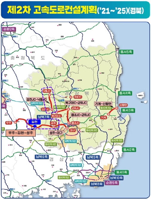 “무주~김천~성주”간 고속도로는 총연장 68.4㎞ 구간에 총사업비 3조4천억원을 투입할 계획이고, “김천 분기점에서 낙동 분기점”간 중부내륙고속도로 확장사업은 총연장 24㎞ 구간에 총사업비 4천8억원이 투입되는 대형사업이다.