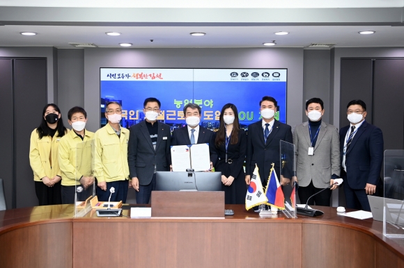 | 외국인계절근로자 도입을 위한 필리핀과의 업무협약(MOU)체결로 농촌일손부족 해소에 김천시가 팔을 걷어 붙였다. 김천시(시장 김충섭)는 지난 1월 28일 김천시청에서 필리핀 팜팡가주 루바오시와 외국인계절근로자 도입을 위한 업무협약(MOU)을 체결했다.