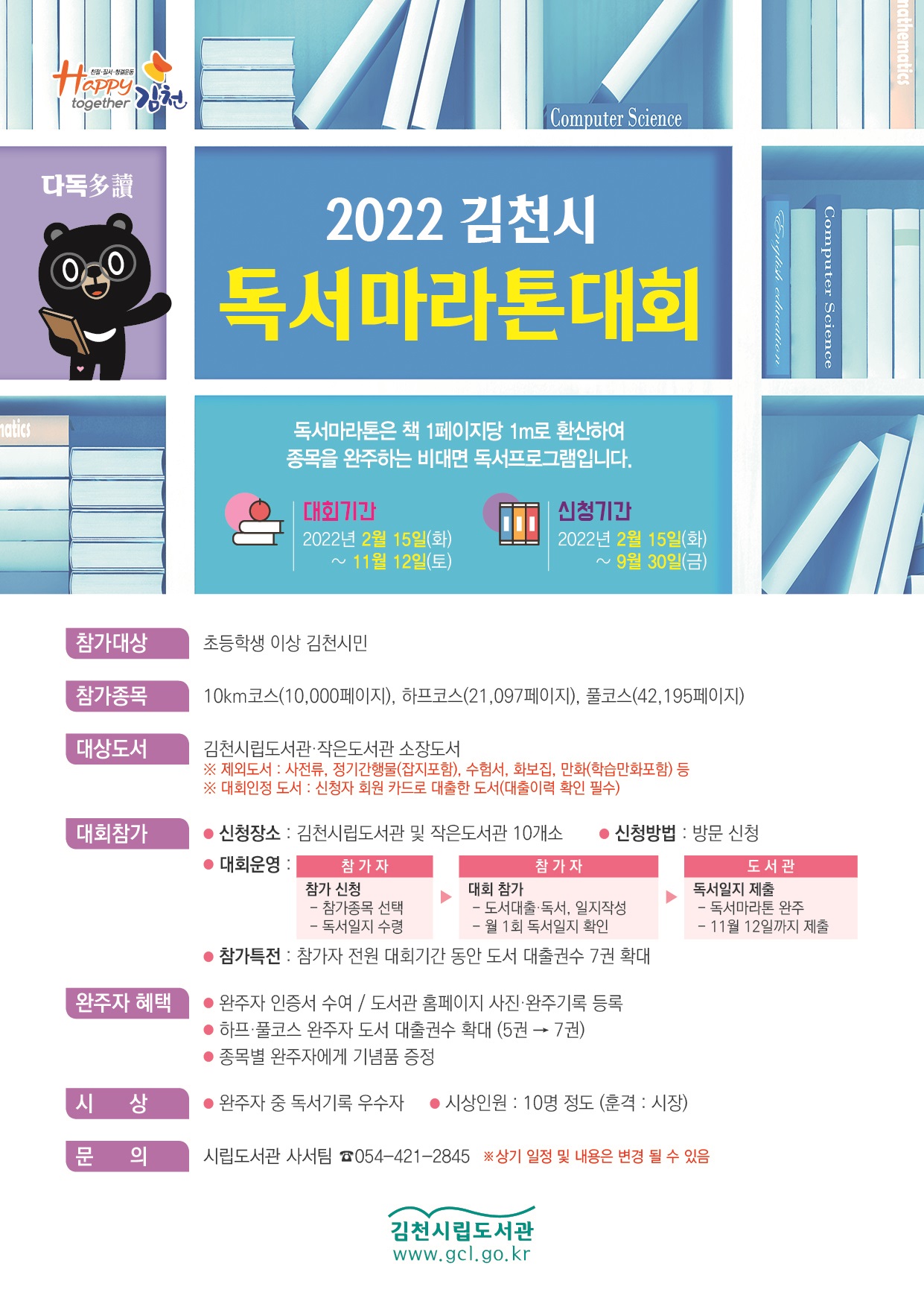 대회 참가자는 도서 대출권수를 7권으로 확대 운영하며, 시립도서관(본관)과 작은도서관에 비치된 책을 대출해서 읽은 후 신청 종목별 독서일지를 작성하여 제출하면 된다. 또한, 대회 종료 후 심사를 통해 완주 인증서와 기념품, 우수 완주자에게는 김천시장 표창 등 시상도 이뤄질 예정이다.