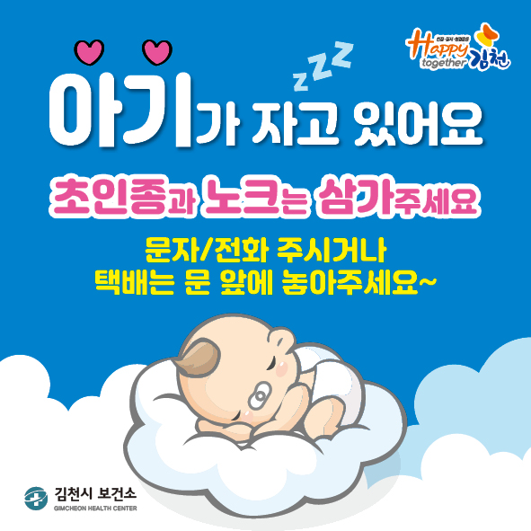 | 김천시에서는 신생아와 출산가정의 부모가 한번쯤은 겪었을 초인종으로 인한 불편함을 해소하고자 출산 및 영유아가정을 대상으로 ‘아기가 자고 있어요.’ 자석스티커를 제작해 무료로 배부한다.