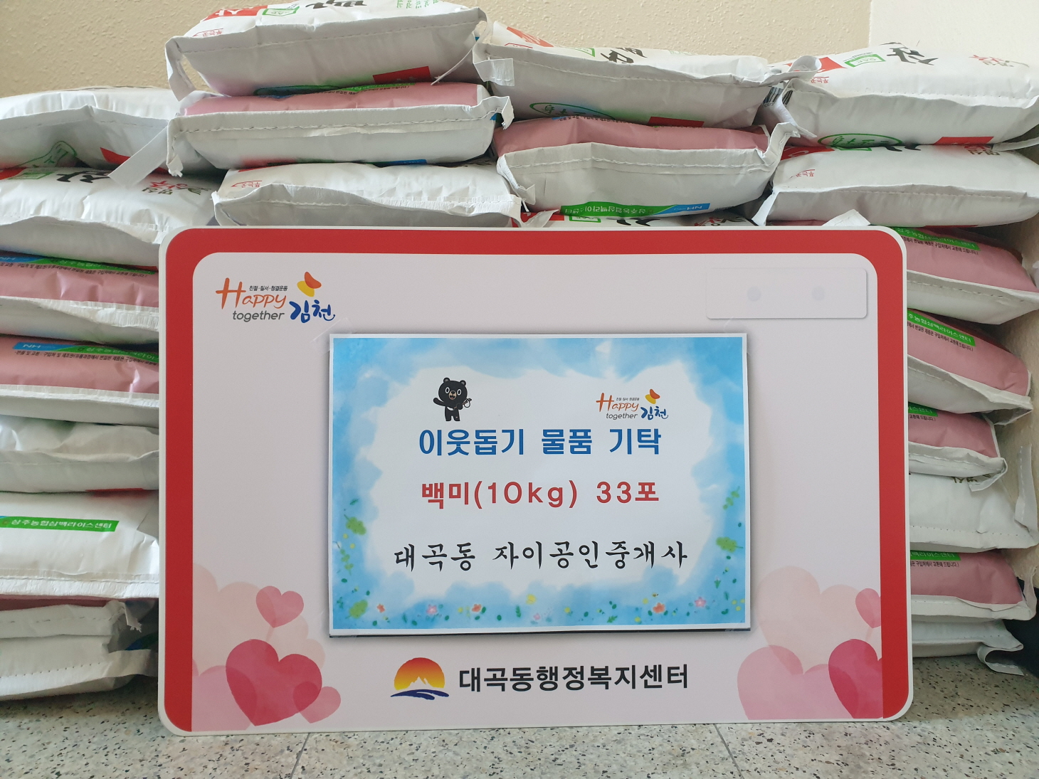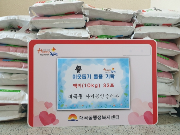 | 지난 9일 대곡동 자이공인중개사(대표 윤준영)에서 동절기를 맞아 관내 생계가 곤란한 독거노인, 장애인 등 복지대상자에게 전달해 달라며 150만원 상당의 백미(10kg) 33포를 대곡동행정복지센터에 기탁했다.