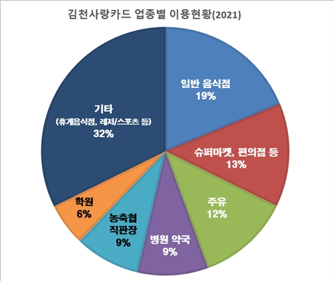 김천사랑상품권 주요 이용처는 ▲일반음식점(19%), ▲슈퍼마켓·편의점(13%), ▲주유소(12%), ▲병원·약국(9%), ▲학원(6%) 등으로 다양하게 사용이 가능하다.