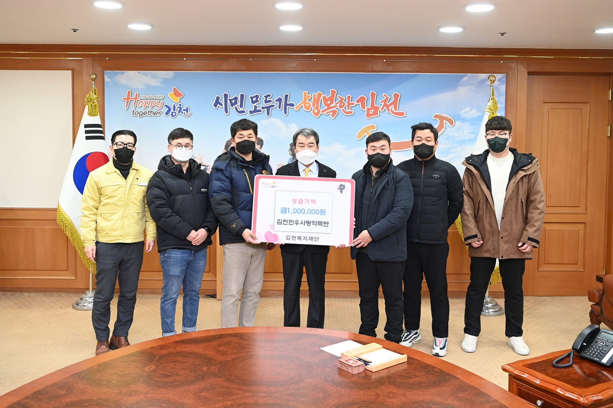 | 김천한우사랑작목반(작목반장 정태수)은 14일 복지 사각지대의 불우이웃 돕기에 동참하고자 김천시(시장 김충섭)를 방문해 성금 100만원을 김천복지재단에 기탁했다.