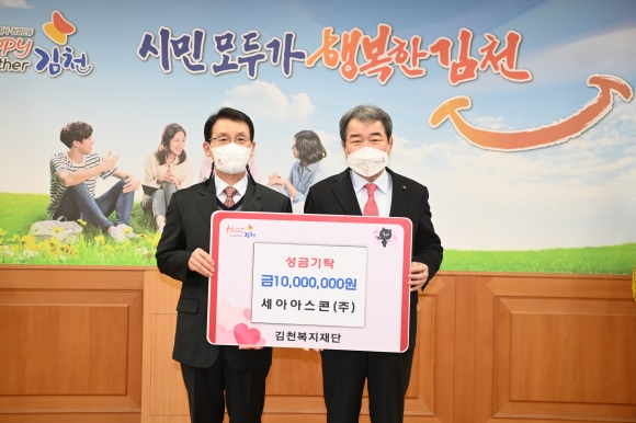 김충섭 김천시장은 “코로나19 사태의 장기화로 인해 모두가 어려운 이 상황에서 나눔과 상생의 가치를 실현하는 신수철 대표님 이하 세아아스콘 직원들에게 감사드린다”며 “전달받은 기부금은 복지재단을 통해 더불어 살아가는 행복공동체 김천을 선도하는 데 쓰도록 하겠다”고 밝혔다. |