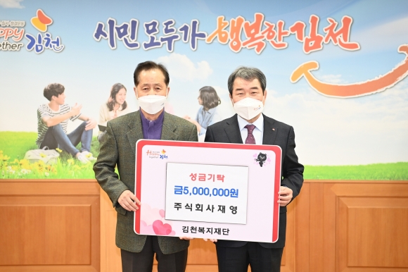 | 관내 기업체의 따뜻한 손길이 김천복지재단을 통해 이어지고 있는 가운데 지난 21일 (주)재영(대표 심택수)에서 5백만 원의 성금을 기탁했다.