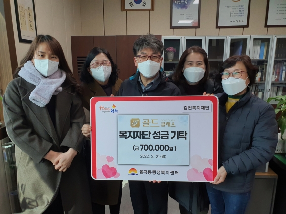 | 김천시 율곡동행정복지센터(동장 이우문)에서는 지난 21일 율곡동 소재 골드클래스아파트에서 이웃돕기 성금 70만원을 기탁했다고 밝혔다.