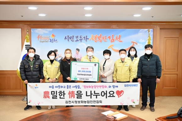 | (사)김천시정보화농업인연합회(회장 김경희)는 회원들의 정성어린 성금을 모아우리 지역에 도움이 필요한 분들을 위해 써달라며 지난 22일 김천복지재단에 200만원을 기탁했다.