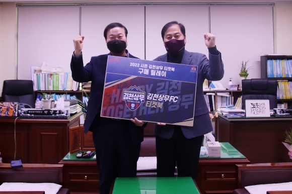 김천상무프로축구단이 25일 오전 10시 30분 김천시의회에서 이우청 김천시의회 의장, 나영민 부의장, 박영록 행정복지위원장, 이복상 산업건설위원장의 티켓북 구매 릴레이 행사를 열었다. 김천상무 구단주, 후원회장, 대표이사, 단장과 김천시 내 고위 관계자들에 이어 김천시의회가 티켓북 구매 릴레이에 동참했다.