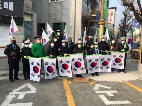 | 새마을교통봉사대 김천시지대(지대장 박태규)는 2월 26일 대원 10여명이 참석한 가운데 삼일절을 기념하여 모암동 일대 상가 100여곳에 태극기를 달아주고, 시민들에게 태극기를 배부했다고 밝혔다.