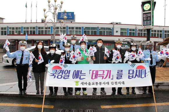 | 새마을교통봉사대 김천시지대(지대장 박태규)는 3월 1일 대원 20여명이 참석한 가운데 김천역, 버스터미널, KTX김천구미역 등지에서 103주년 삼일절을 기념하여 차량용 태극기 달기 캠페인을 펼쳤다. 지난 26일에는 모암동 일대 상가에 태극기를 달아 국경일 분위기를 조성하기도 했다.