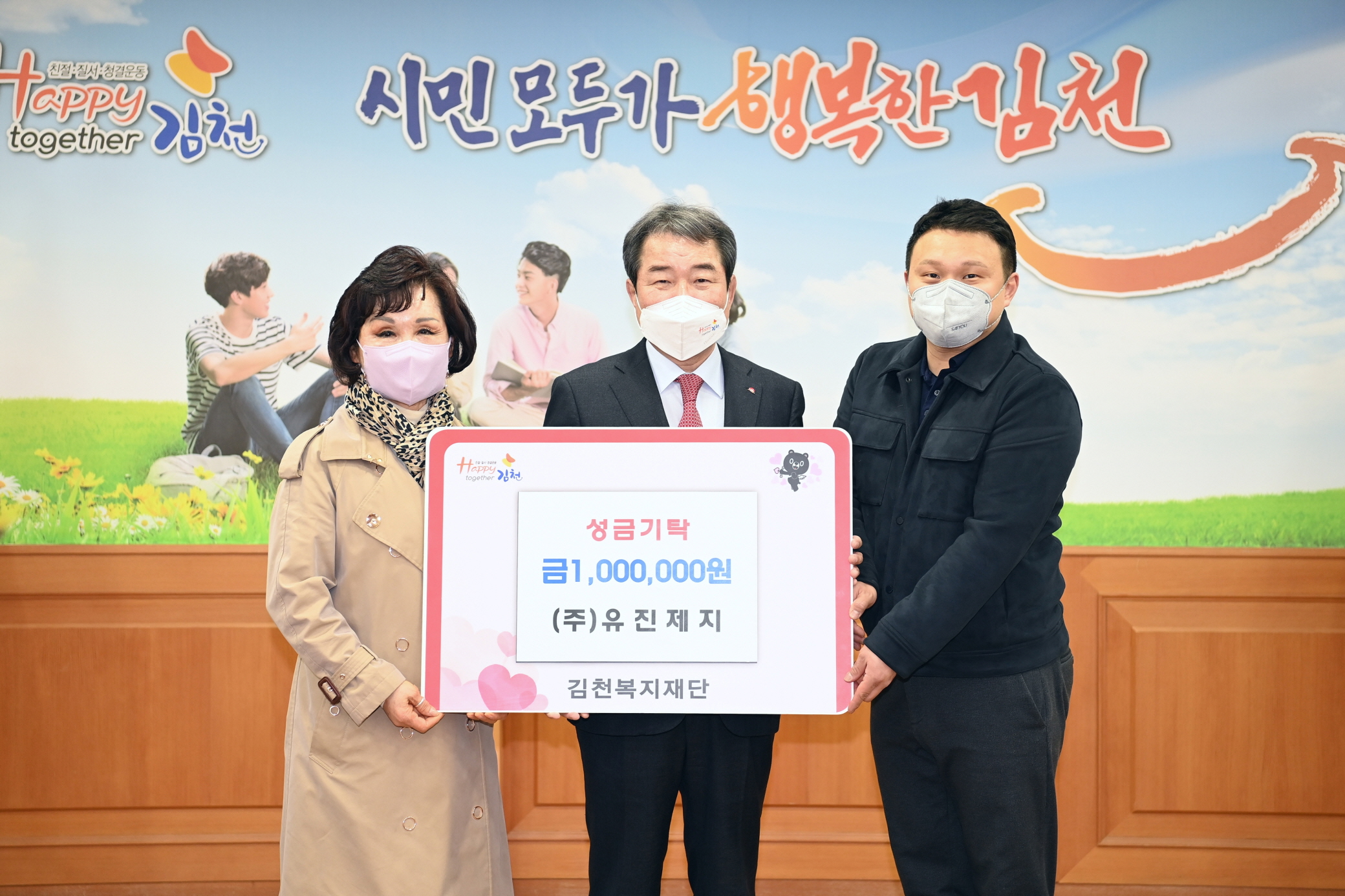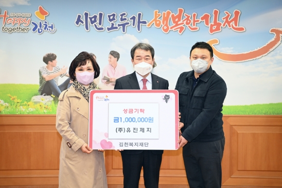 ㈜유진제지(대표 김은숙)는 이번에 100만원을 김천복지재단으로 기부했다. ㈜유진제지는 김천시 대신동에 소재하는 종이제품, 위생용지를 생산하는 기업으로 2021년 4월 김천시 이달의 기업으로 선정되었고, 평소에도 매년 이웃돕기 성금을 기부하는 등 지속적인 사회공헌활동에 참여하고 있다.