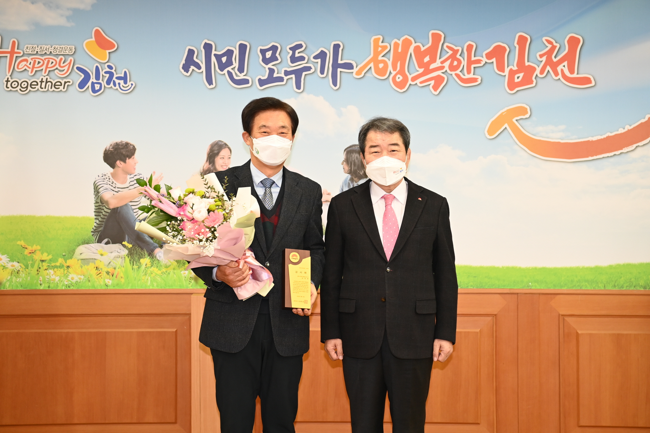 | 김천시(시장 김충섭)는 24일 농업·농촌의 발전과 귀농귀촌활성화에 이바지 한 귀농연합회 강성준 전 회장에게 감사패를 전달하고 격려했다. 강성준 전 회장은 2014년 조마면으로 귀농하여 올해 9년차 포도(샤인머스켓) 농사를 짓고 있으며 2020년 ~ 2021년(2년간) 귀농연합회 회장으로 역임했으며, 처음 시작하는 귀농·귀촌인들에게 노하우 전달과 멘토역할을 자처하여 안정적인 정착을 돕고, 도시민들을 농촌으로 적극 유입하여 김천시 귀농귀촌인 인구 증가에도 힘썼다.