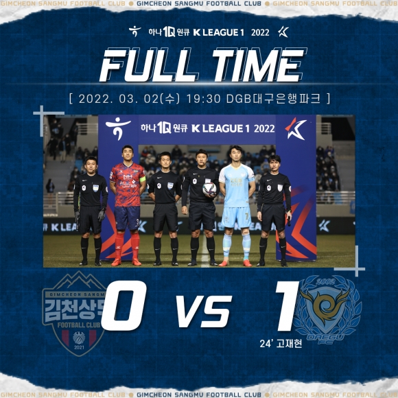 김천상무프로축구단(대표이사 배낙호)이 2일 오후 7시 30분, DGB대구은행파크에서 열린 ‘하나원큐 K리그1 2022’ 3R 대구FC와 경기에서 0대 1로 패했다.