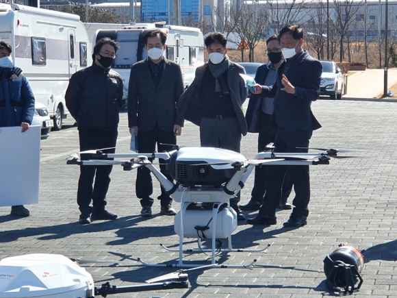 먼저, 디지털물류실증사업의 핵심인 드론이 지난해 선정된 드론 특별자유화구역 상공을 선회하는 시범 운행 참관을 시작으로, 지역거점 드론 실기시험장 조성지, 자동차 복합서비스 단지 및 튜닝카 성능‧안전 시험센터, 자동차 주행시험장 조성 현장 브리핑에 참여한 후,