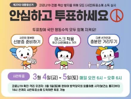 한편. 제20대 대통령선거 사전투표는 2022.3.4.(금) ~ 3.5.(토) 06:00~18:00까지 주소지와 관계없이 신분증을 지참해서 가까운 사전투표소를 방문하면 투표가 가능하며 확진자 또는 자가격리자인 경우에는 3.5.(토) 방역당국의 외출 허용 시각부터 18:00까지 또는 선거일인 3.9.(수) 18:00~19:30에 지정된 투표소를 방문하면 투표에 참여할 수 있다. |