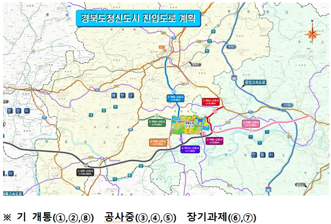 먼저, 예천 지보면 어신리와 호명면 금능리를 연결하는 총연장 4.63km의 국도28호선~신도시 연결도로 개설공사(③번 도로)는 현재 77%의 공사 진척을 보이고 있으며, 올 상반기 준공을 위해 도로 포장 등 잔여 공종에 박차를 가하고 있다.