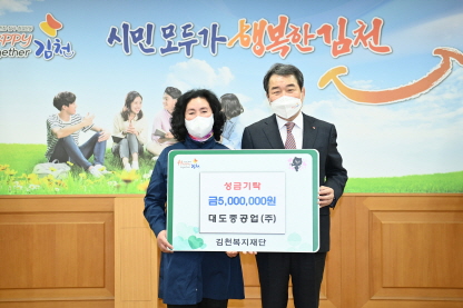 김충섭 김천시장은 “코로나19 장기화로 기업들 또한 어려움을 겪는 가운데, 따뜻한 나눔을 실천하고자 소중한 성금을 기탁해주신 대도중공업 대표 및 임직원들에게 감사드린다.”며 “전달해주신 소중한 성금은 도움이 필요한 이웃들에게 큰 희망이 될 것이다.”고 말했다.