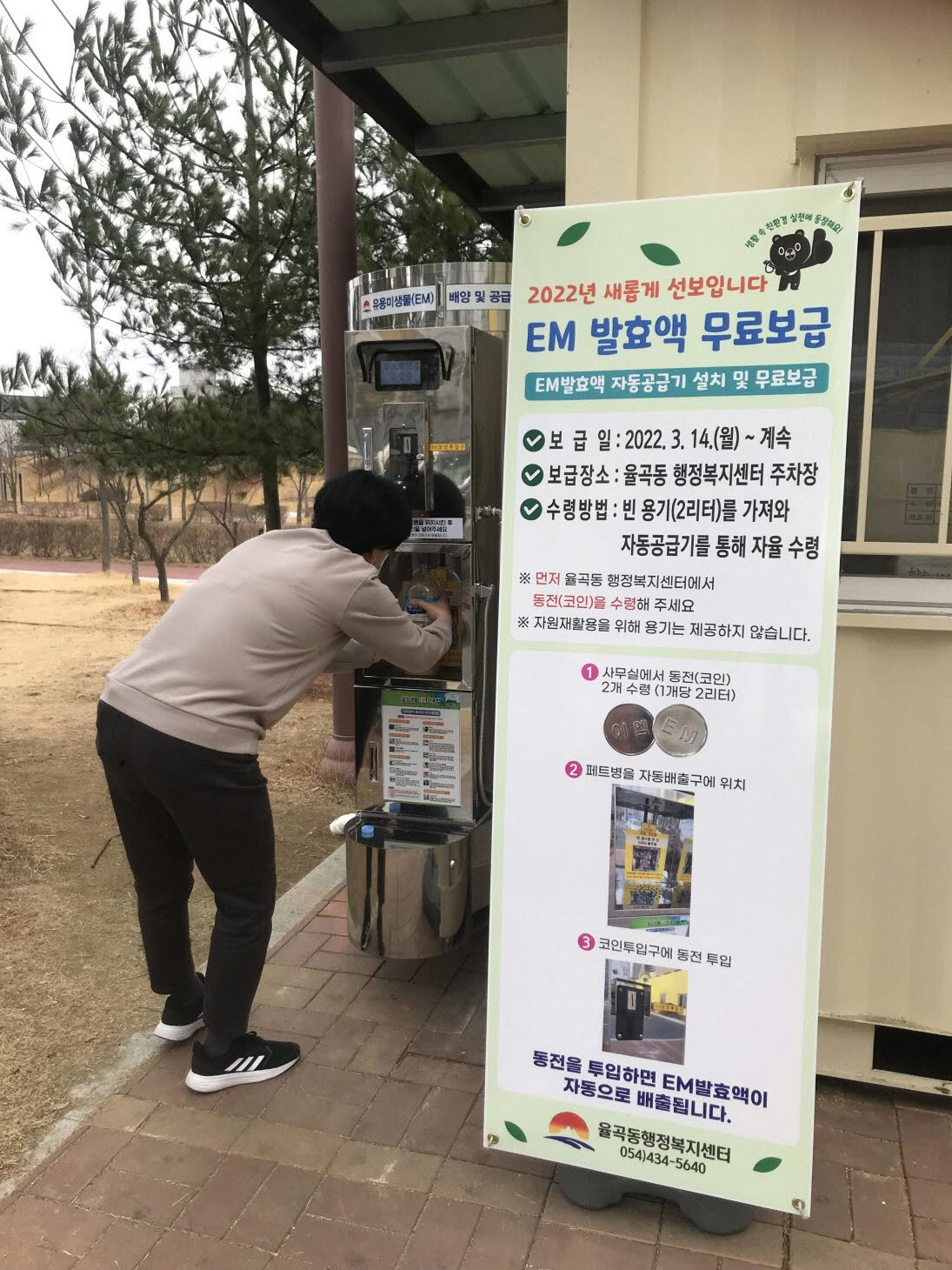 | 김천시는 시민들이 친환경 유용미생물(EM) 발효액을 이용해 환경보호에 동참할 수 있도록 대곡동, 지좌동, 율곡동 행정복지센터 3개소에 EM 발효액 무인공급기를 설치하고, 3월 14일부터 무료 보급을 시작했다.