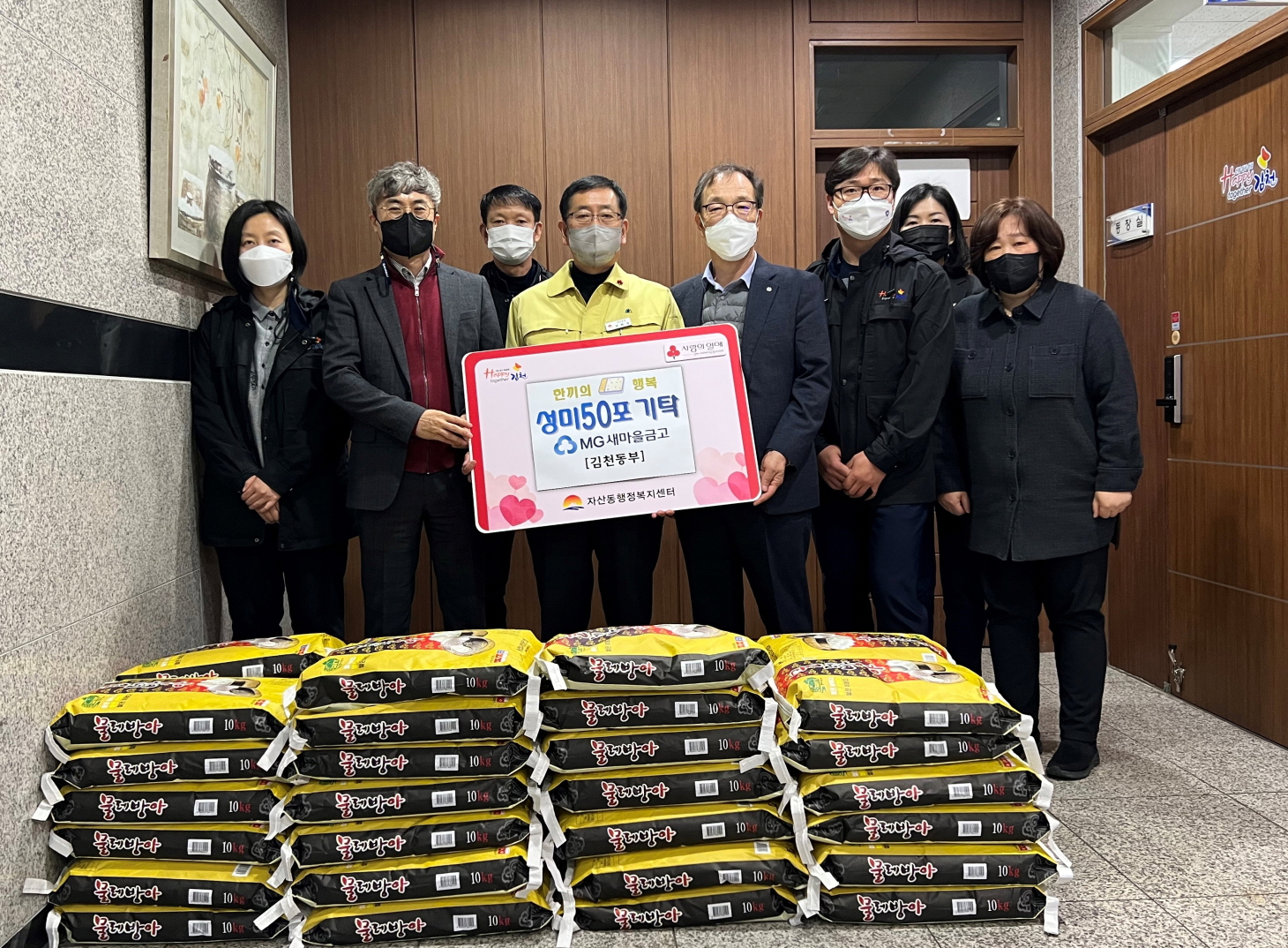 | 김천동부MG새마을금고(이사장 조성태)에서는 지역사회 봉사활동의 일환으로 어려운 이웃들에게 줄 쌀 50포(10kg)를 자산동행정복지센터에 기탁했다. 자산동행정복지센터에서는 기탁 받은 성품은 자산동 내 37개통 별로 기초생활수급자, 독거노인, 한부모가정 등 소외계층 인구수에 비례해 1~2포씩 배포할 예정이다.
