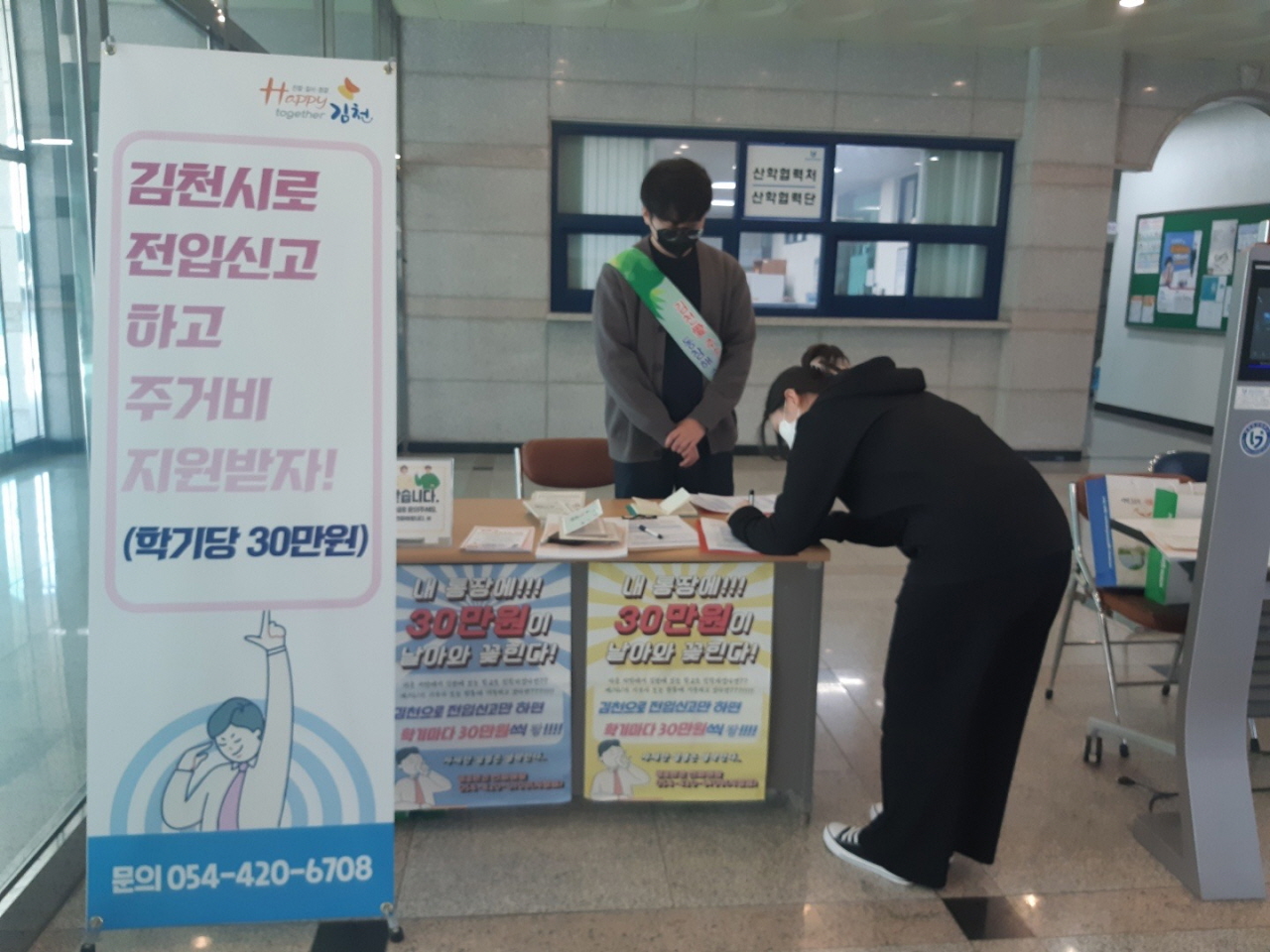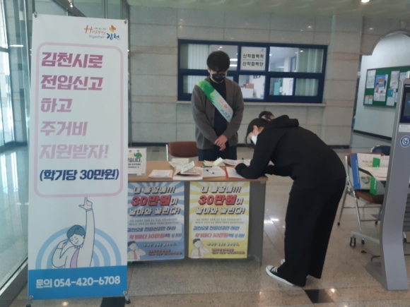 한편 김천시는 김천대학교를 시작으로 관내 대학교에 찾아가는 현장전입반을 정기적으로 운영하여 전입신고뿐만 아니라 인구증가시책 지원금 신청도 현장에서 접수를 받는다. 관련 문의는 김천시청 기획예산실 인구정책팀으로 하면 된다. |