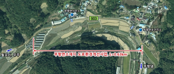 부항면소재지 도로환경개선사업은 총사업비 11억원을 투입하여 0.6km구간에 대해 선형개량과 노견확보로 도로환경을 개선할 계획으로 2023년 7월 준공을 목표로 사업을 추진 중에 있다.