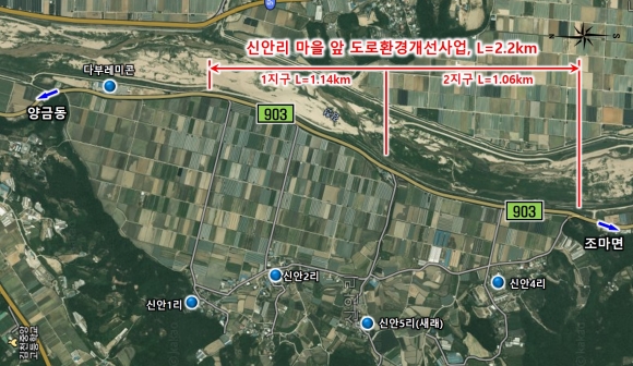 조마면 신안리 마을 앞 도로환경개선사업은 총사업비 13억원을 투입하여 2.2km구간에 대하여 선형개량과 보행공간을 확보할 계획으로, 신안1리(죽정)~신안5리(새래) 1.2km구간을 우선 착공하여 금년 준공을 목표로 공사가 원활히 추진되고 있으며, 신안5리(새래)~신안4리 1.0km구간은 2023년에 착공하여 사업을 완료할 계획이다.