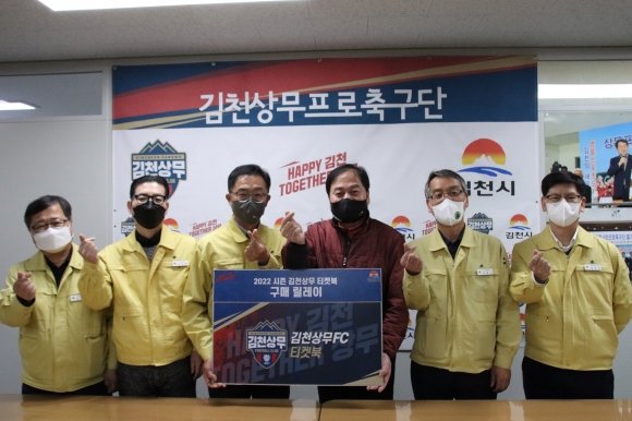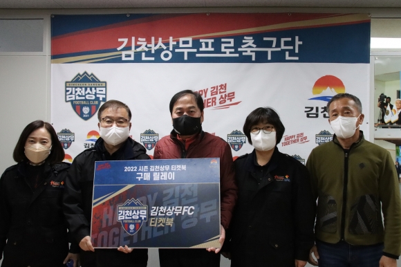 김천상무프로축구단이 22일 김천상무 대표이사실에서 티켓북 구매 릴레이 행사를 열었다. 김천시청 건설안전국 이도우 국장 외 7명, 농업기술센터 김병수 소장 외 4명, 김천시보건소 장재근 소장 외 3명이 행사에 참여했다. 건설안전국은 10권을, 농업기술센터는 6권을, 김천시보건소는 3권을 구매했다.