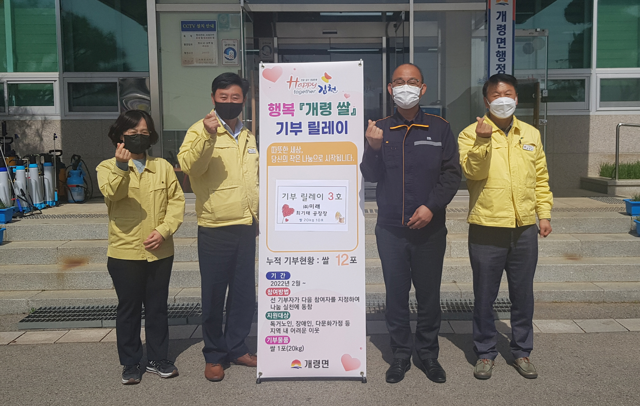 | 개령면행정복지센터(면장 이승만)는 지난 2월부터 Happy together 실천과제로 추진하고 있는『행복 개령쌀』나눔 기부릴레이 2회째를 맞이하여, 기부행렬이 끊이지 않고 이어지고 있다.