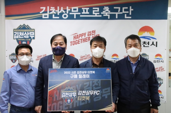 김천상무프로축구단이 29일, 김천상무 대표이사실에서 개인택시운송조합 김천시지부 티켓북 릴레이 구매 행사를 열었다. 행사에는 개인택시운송조합 김천시지부 이재성 대표, 배낙호 김천상무 대표이사, 이흥실 단장이 참석했다.