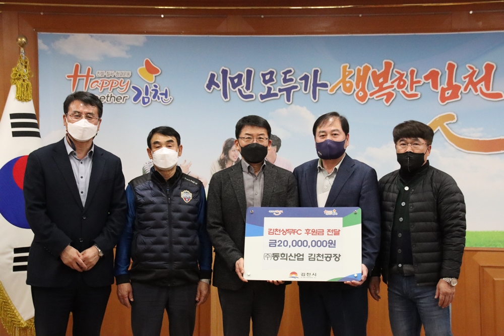 | ㈜동희산업이 김천상무에 후원금 2천만원을 전달했다. 김천상무프로축구단이 29일 오후, 김천시청 2층 접견실에서 김천상무의 후원금 전달식을 진행했다. 후원금 전달식에는 박주은 ㈜동희산업 대표이사, 정하승 김천공장 공장장, 동희홀딩스 박성철 팀장, 김영진 선임 매니저를 비롯해 김충섭 김천상무 구단주, 배낙호 대표이사, 최한동 후원회장, 이흥실 단장이 참석했다.