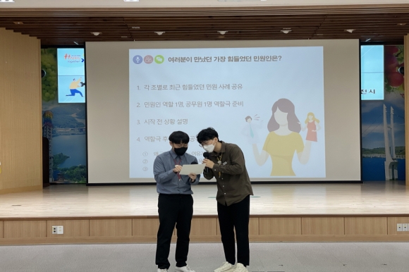 “초보 공무원, 친절 연수중!”이라는 이름으로 진행하는 이번 교육은 다양하고 복잡해지는 민원인을 응대하는 능력을 높이고 신뢰받는 민원행정서비스를 제공하기 위해 마련됐으며, 3명의 강사(임성일, 송애랑, 박은미)를 투입해 체계적이고 실용적인 교육을 진행했다.