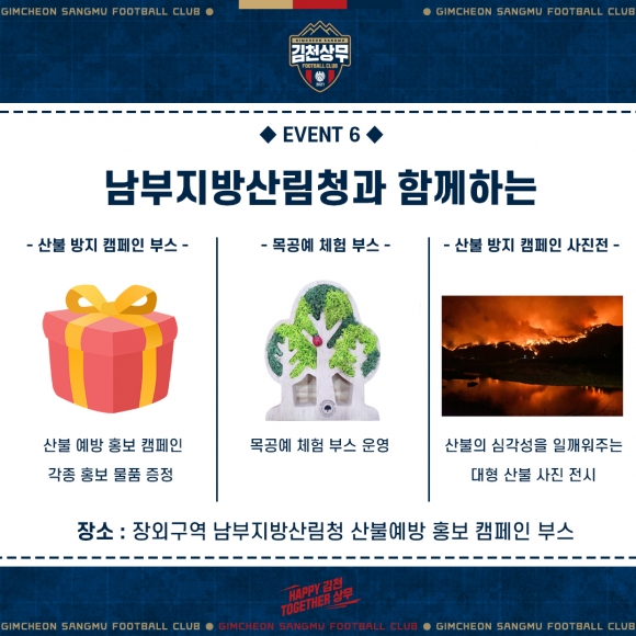 | 김천상무가 수원삼성전 홈경기에서 남부지방산림청과 연계해 산불 예방 홍보 캠페인을 실시한다.