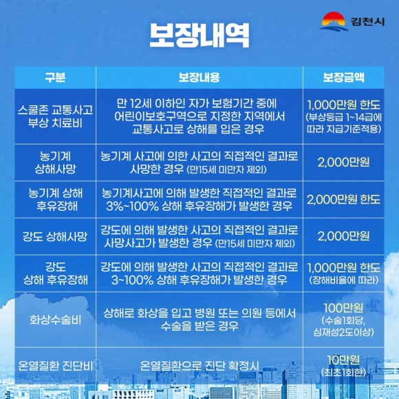 | 김천시(시장 김충섭)는 재난이나 각종 안전사고로 인한 피해를 입은 시민들이 안정을 되찾을 수 있도록 시민안전보험을 운영하고 있다. 시민안전보험은 재난이나 각종 안전사고로 피해를 입은 시민이 안정을 되찾을 수 있도록 보험료를 지원하는 제도로서, 보험료는 시에서 일괄 납부하며, 김천시에 주민등록이 되어 있는 모든 시민(등록된 외국인 포함)은 별도의 절차 없이 누구나 자동으로 가입된다.