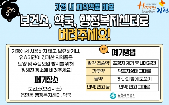 | 김천시 보건소는 최근 코로나19 확진자 증가에 따른 복용 약 조제건수가 많아지는 것과 비례하여 가정 내 복용하지 않거나 유효기간이 경과된 폐의약품이 다수 발생될 것에 대비하여 올바른 폐의약품 분리배출 방법에 대해 적극 홍보하고 있다.