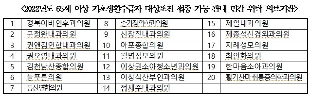 이에 김천시에서는 만 65세 이상(1957년 12월 31일 이전 출생자) 어르신 중 김천시에 주소를 둔 기초생활수급권자 어르신 중 한 번도 접종을 하지 않았다면 1회 무료접종이 가능하며, 접종 전 반드시 의료기관이나 보건기관 방문 전 접종 대상인지 확인 후 방문하기를 당부했다.