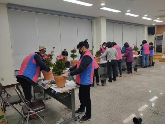 | 증산면 생활개선회(회장 백순례)는 3월 30일 시루메권역 복지센터에서 30명의 회원을 대상으로 코로나19와 힘든 일상으로 인해 지친 마음을 꽃을 통하여 치유와 위로를 받을 수 있도록 하는 교육프로그램을 시행했다.