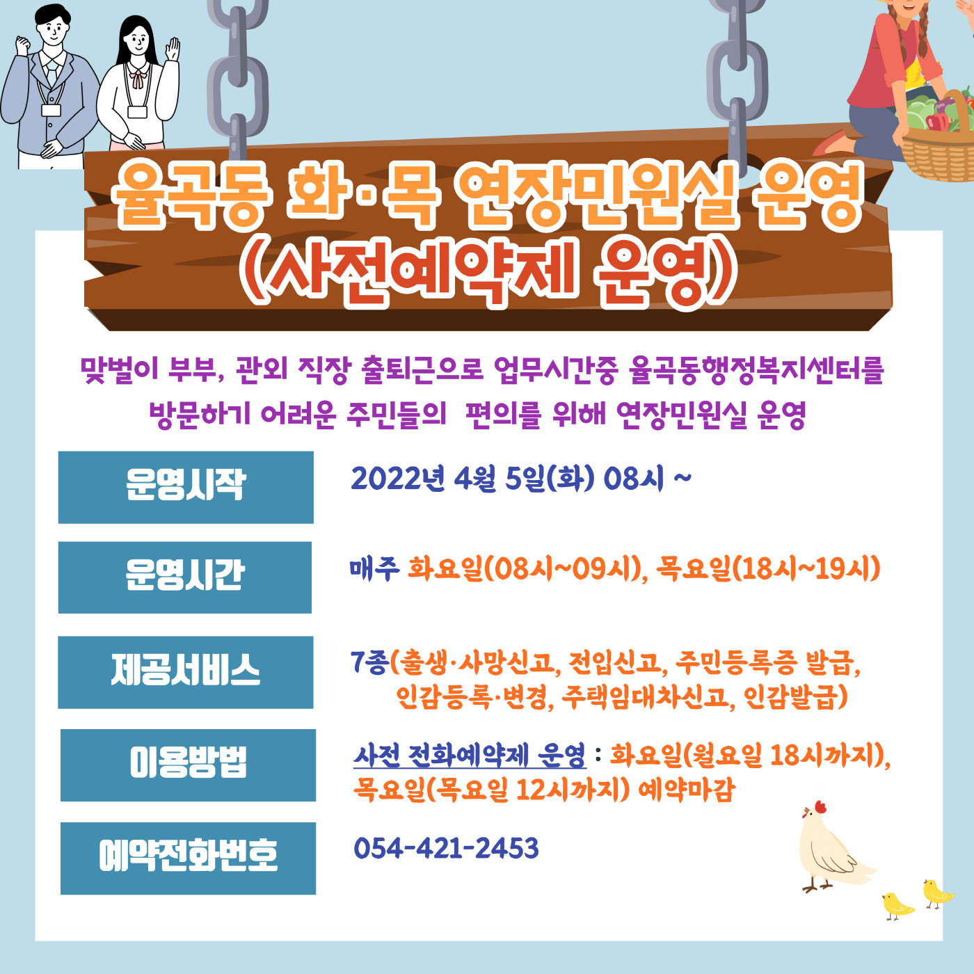 율곡동행정복지센터 한시간 빠른(화요일) 한시간 더하는(목요일) 민원실 운영