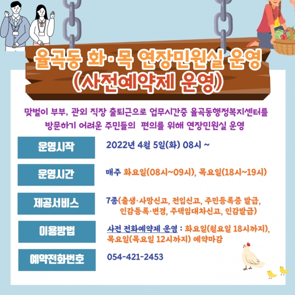 이우문 율곡동장은 “직장인, 맞벌이 부부가 많은 율곡동 특성상 업무시간 중에 율곡동행정복지센터를 방문하기 어려운 주민들을 위해 주 2회 1시간씩 연장 민원실을 운영하게 됐다.”며 “무인민원발급기로 제공받지 못하는 7종의 민원서비스에 한해 사전에 예약을 받아 서비스를 제공하게 되므로 이 점 유의하시기 바란다.”고 했다.